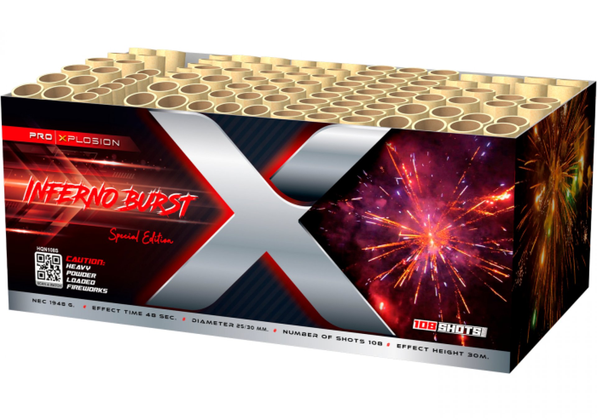 Rode strobe, titanium gold tails en felle neon effecten wisselen elkaar razendsnel af. Inferno Burst bouwt op naar een vurige climax en houdt de aandacht vast tot het laatste schot. Uniek in z’n tempo. Onmiskenbaar in z’n stijl