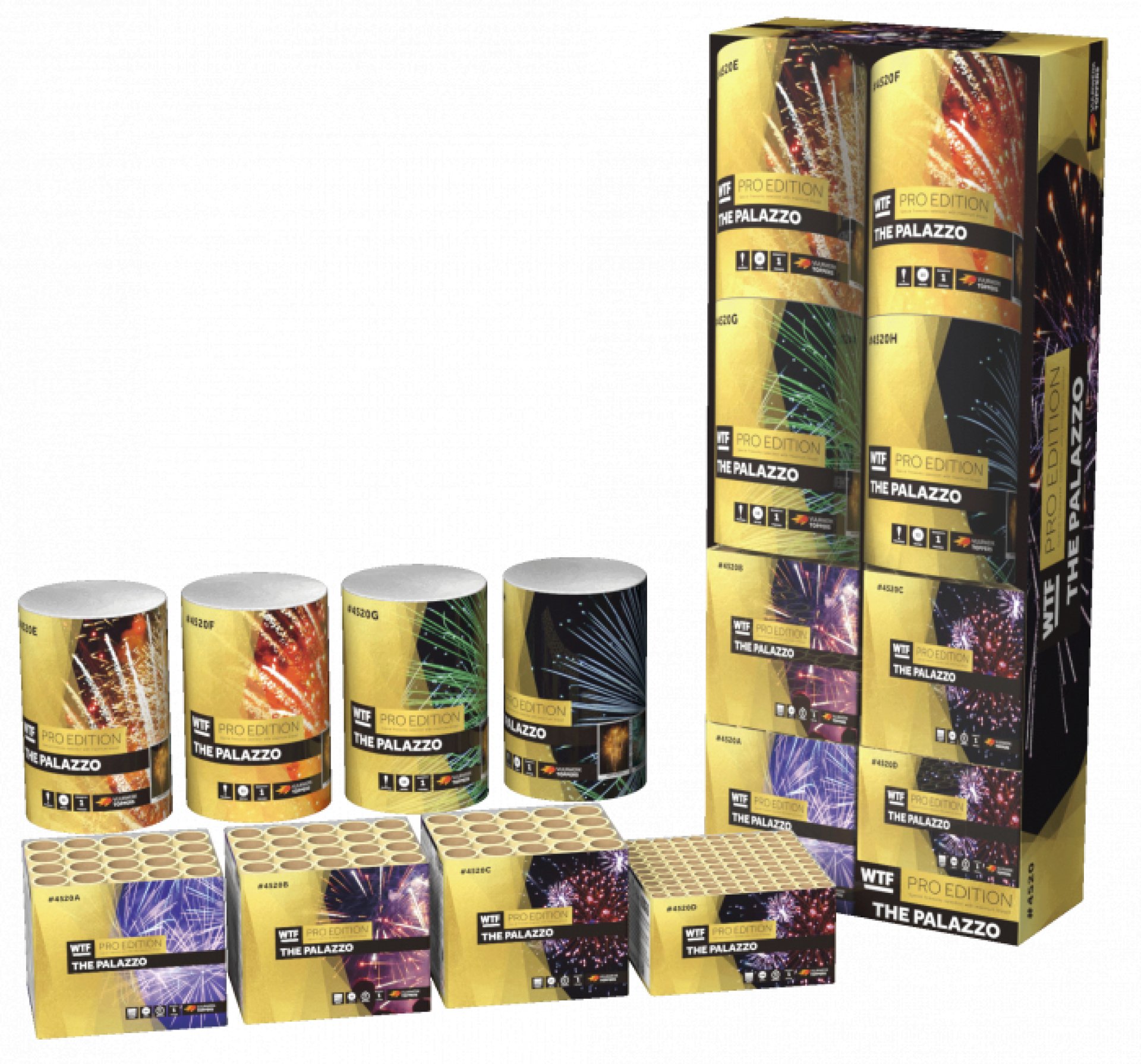 The Palazzo, een mega pakket bestaande uit 3 cakes van 20 schoten (totaal 60 schoten), 4 spectaculaire fonteinen en een 100 schots missile cake! Met dit pakket koop je in totaal maar liefst 168 krachtige schoten! De cakes zijn gevuld met prachtige sierlijke effecten die hoog in de lucht uiteenspatten. De fonteinen produceren prachtige glitter effecten die jouw straat zullen verlichten! En vergeet de fluiters niet die ieders aandacht trekken. Een pakket om met je hele familie van te genieten